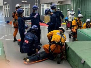 今回、足場の崩落事故を想定し、複数の作業員が転落や挟まれなどにより負傷したという設定で実施しました。