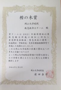 救急救命士が楷の木賞を受賞いたしました 救急救命士チームが楷の木賞を受賞いたしました。 救命士は緊急車両運用、災害医療体制構築等に携わり、病院の医療の質向上に日々取り組んでいます。 これからも活躍の場を広げていきますので、皆様よろしくお願いいたします。